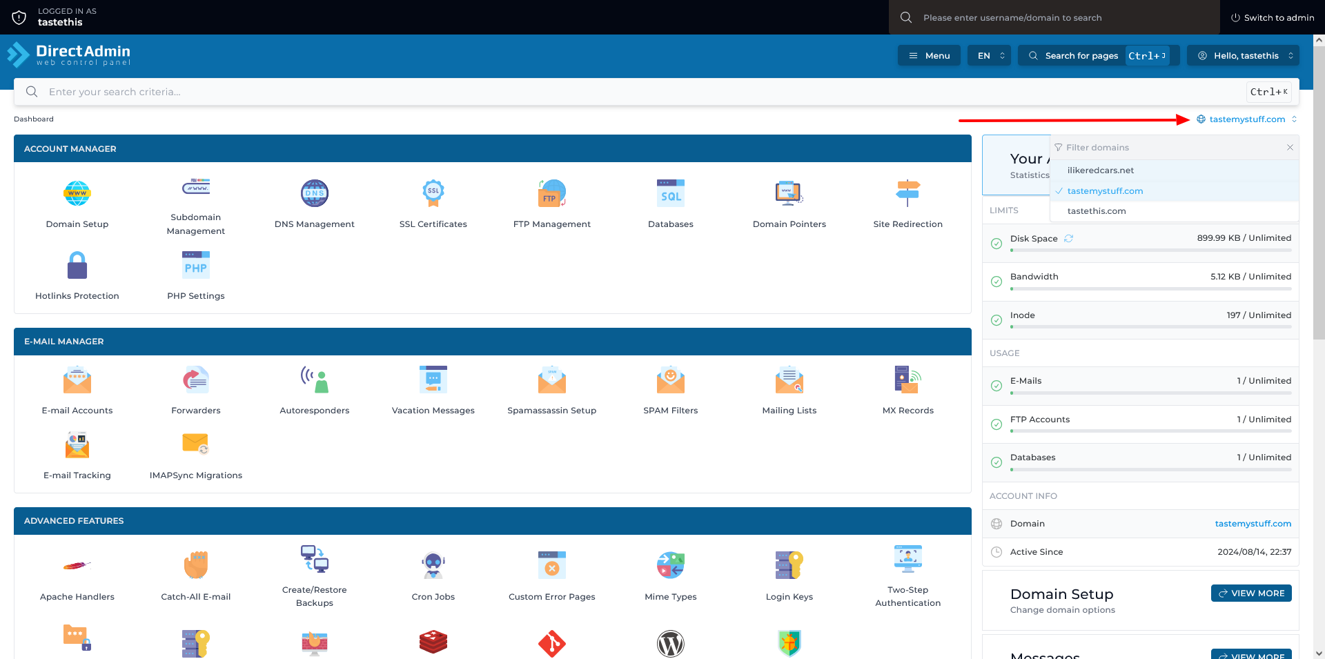 - Once logged in, if you have more than one domain name, make sure you have selected the domain name you want to create emails for as per the image below. If you have registered the domain but not yet added it, please use this Tutorial to Learn how to add an add-on domain to your direct admin control panel.