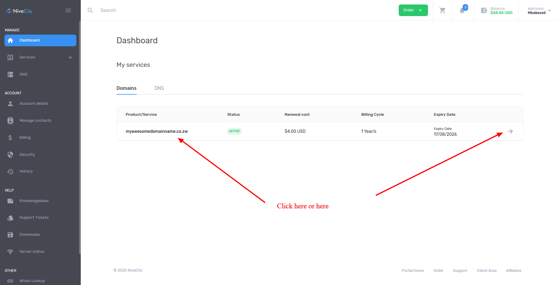 Log into your Clientzone and from your dashboard you should be able to see a page like this, if not, click on Services then Domains and then select the domain you want to update as per the image below.