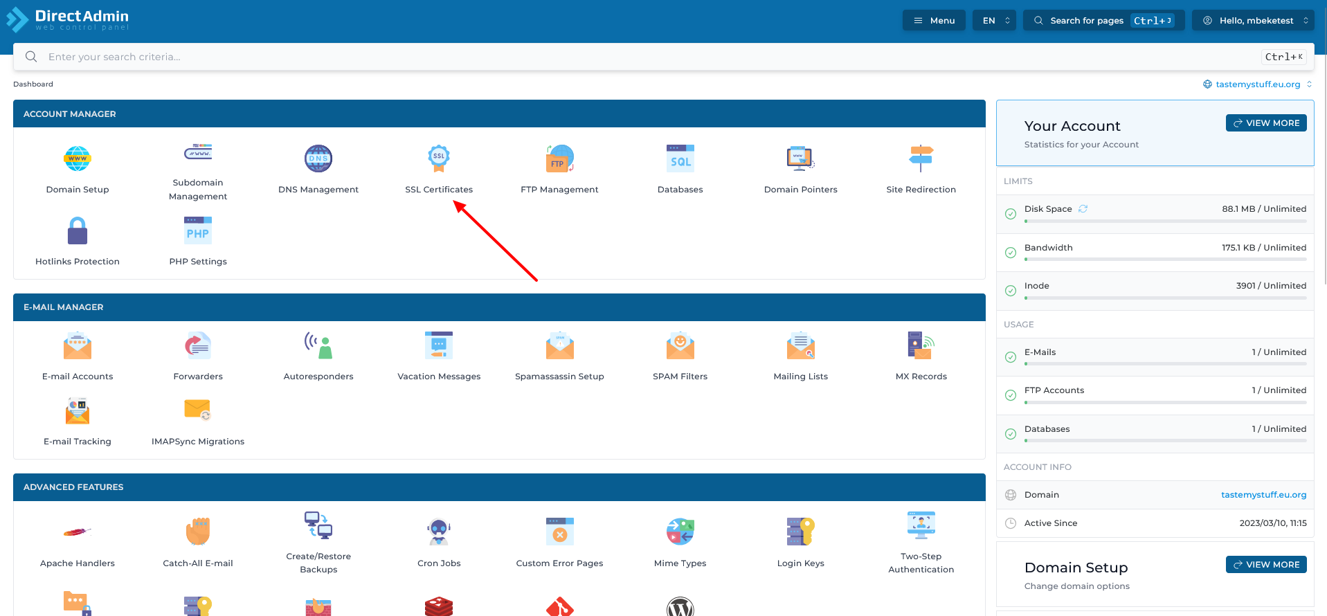 - Login to your Direct Admin control panel from https://yourdomain.com:2222 replacing yourdomain.com with your actual domain name, and you will be presented with the options below